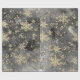 A neutral holiday wrapping paper in a black and white tone featuring a watercolor painted dusk sky background with painted gold berries on branches under golden snowfall and oversized gold snowflakes.