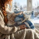 Step into an enchanting winter wonderland with this ethereal artwork featuring a graceful princess draped in intricate blue and silver attire. Her flowing gown, adorned with delicate botanical patterns, mirrors the frost-kissed beauty of the snowy landscape around her. A gentle bird perches on her outstretched scarf, adding to the serene, fairytale-like atmosphere. Soft, golden curls contrast with the icy surroundings, creating a mesmerizing blend of warmth and winter’s quiet magic. The scene evokes the elegance of vintage storybook illustrations with a touch of fantasy, making it perfect for lovers of castlecore aesthetics, regal charm, and whimsical seasonal beauty. This dreamy depiction of a winter princess captures the peaceful solitude of snow-covered landscapes, inviting you into a world of timeless enchantment. AI generated artwork.
