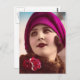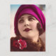 Colorized vintage photograph of a beautiful young lady in fur collar and fuschia hat. Dark red lipstick and red flower on her collar.