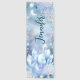 Step into a serene winter wonderland with this stunning, ethereal personalized bookmark, featuring a misty blend of pale blues and lavenders like a moonlit night sky. The top showcases frosty flowers and icy foliage with a faint, pearly crescent moon nestled among them. Further down, a cluster of hyper-realistic, faceted crystals in icy blues and white emerge from intricately drawn, shimmering winter flowers, glowing from within. The entire design sparkles with scattered starbursts, twinkling dots, and subtle glows, creating a magical and luxurious effect. This enchanted accessory captures a snapshot of a winter's night where nature and magic intertwine, adding a serene touch to your reading.