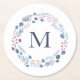 Winter blue foliage wreath on a round paper coaster with custom monogram in the middle in sans serif font