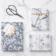 A trio of papers featuring a watercolor repeating pattern of pretty silver gray leaves on medium grey; dusky blue, tan and grey snowflake shapes on white and a beautiful bird sitting on foliage leaf strands set against a pale blue background. Ideal for all special wedding, birthday, anniversary and engagement parties.