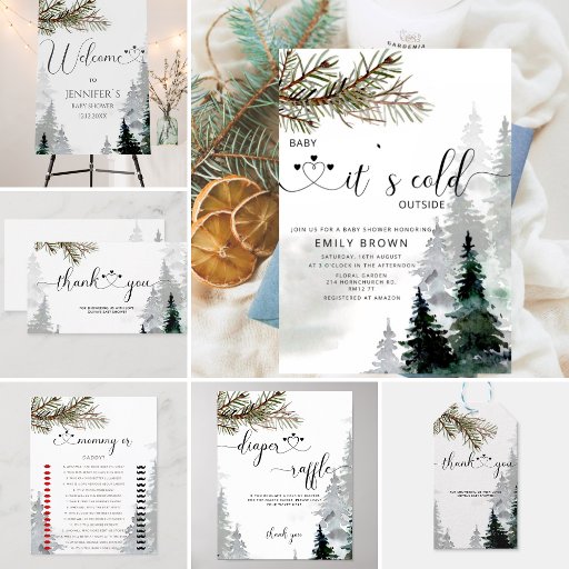 Сustom printed winter baby shower invitations in a pretty gender neutral color palette. This sweet design features a forest of watercolor evergreen trees сhristmas tree branch and modern hand lettering style script that says Baby It's Cold Outside - perfect for a rustic winter baby shower theme. Personalize it with your event details for baby boy or girl.