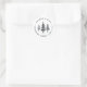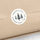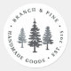 Rustic chic stickers for your outdoor, adventure, or nature-oriented business feature a trio of blue and gray pine trees with two custom text fields in a curved circular design.