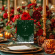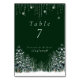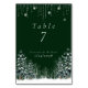 Winter Wedding Pine Trees Snowflakes table number card has a beautiful dark green background with snow covered Pine Trees, white Winter trees, snowflakes and pretty hanging sparkle effect. Personalize with your information.
