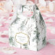 These modern, holiday wedding favor boxes feature a trendy winter pattern of green pine trees, bare forest branches, and lots of snow, with a faux gold frame in the center.