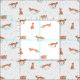 Hand painted watercolor pattern designed by Shelby Allison featuring four different fox characters on a snowy white winter background.