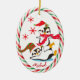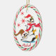 This cute Holiday ornament is perfect for a grandparent or grandparents to give to a grandchild. Two cute little penguins dressed in colorful winter hats and scarf frolic on the ice on the front while red snowflakes drift down around them. Below the image is your special child's name. The image is framed with a pretty red, green, and white candy cane stripe pattern. The back of the ornament has the same striped frame, and more text fields for you to customize.