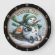 Embrace "Winter Fun" with this cheerful round sign featuring a rosy-cheeked snowman wearing a green knit hat, scarf, and mittens. He's happily sledding down a snowy hill with a little robin bird passenger. This playful scene is set against a backdrop of snowy pines and falling snowflakes, making it a cute and inviting seasonal accent.