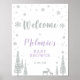 This winter wonderland party welcome sign features cute snowflakes and the script text in silver glitter texture. Perfect for a winter wonderland themed baby shower or baby sprinkle for your little girl!