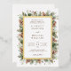 This real gold foil winter holiday wedding invitation features hand-painted watercolor greenery and pinecones arranged as a beautiful frame. The text is brown and the background is white. The back includes a stylish matching bouquet. Find matching items in the Pinecone and Greenery Christmas Holiday collection.