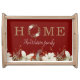Classical serif font on Home sign in gold color with winter foliage wreath as a second letter with family name in rustic script font
