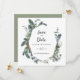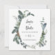 This winter greenery wedding save the date card is perfect for a classy wedding. The modern fall or winter design features elegant watercolor greenery and olive eucalyptus leaves with a rustic holiday feel.