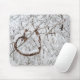 Grapevine heart hanging on a snow-covered tree in winter woods.