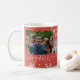 Modern elegant Christmas simple winter holiday family four photo collage mug featuring Together (editable) script lettering with white snowflakes over a rusty red background. +++++++++++++++ Personalize it with your family pictures, name, and text!