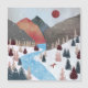 A beautiful landscape with unique textures showing a river and mountain landscape with a fox in md-jump hunting in the snow in shades of red, green, blue, and beige.