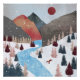 A beautiful landscape with unique textures showing a river and mountain landscape with a fox in md-jump hunting in the snow in shades of red, green, blue, and beige.