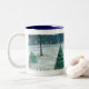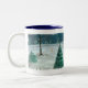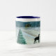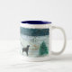 A two-tone ceramic coffee mug featuring a black labrador retriever in the snow.