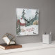 Winter Landscape Lakeside cabin clock lettered with "There's No Place Like Home" in trendy script typography. This rustic country design has a watercolor scene of a lakeside lodge, pine trees, a duck on the lake, snow and a sled.