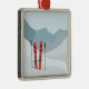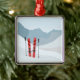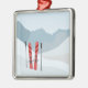Abstract winter landscape with panoramic mountain view, red ski equipment, trail and blue sky