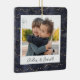 A sweet double sided photo ornament displaying a favorite photo on each side, on a navy blue watercolor background dotted with string lights. Personalize with a custom caption on the front in handwritten lettering, and add the year to the back.