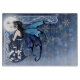Raven haired fairy all in blue. The moon behind the fairy is shining brightly, Snowflakes and Baltic knot work all around them both in a blue ombre backdrop.