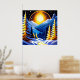 A colorful winter scene featuring snow-covered mountains, glowing evergreen trees, and a radiant moonlit sky. This artful landscape conveys wonder, tranquility, and the magic of a cold, starry night.