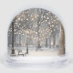 A serene winter night scene snow globe in a snowy park with string lights and park benches in the snow. Set the mood for a cozy holiday with this magical winter scene.