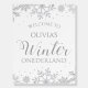 Winter ONEderland first birthday party welcome sign with silver glitter snowflakes.