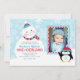 Celebrate a Winter ONEderland first birthday with this photo invitation featuring a cheerful snowman in a hat and scarf alongside a cute arctic penguin in a Santa hat pulling a sled. Space for your child's photo sits beside the festive characters on an icy snowflake background, with a diagonal candy cane stripe pattern on the back. Ice blue, turquoise, red, and white colors with black and gray accents. All text is fully customizable.