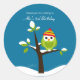 A coordinating sticker for the Winter Owl Invitation featuring an adorable owl dressed in a colorful ski hat who is perched on a snowy tree limb. (Vecteezy.com -eezyPremium). The card is easy to customize with your wording, font, font color, paper shape options and choice of six paper types.