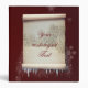 Winter parchment illustration featuring old paper scroll with a snowy landscape and decorated with snow and icicles on a dark red background with snowflakes.