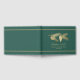 Elegant emerald green and gold tone holiday guest book, with graphics of golden pine cones and pine branch. Personalize the text fields for your holiday open house or Christmas party.