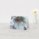 Blank note card with beautiful winter scene of a pine tree and pine cone covered in snow. Matching postage
