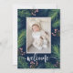 Elegantly sweet winter birth announcements feature your favorite newborn baby photo with a border of pines and berries on Navy or any color you choose, your baby's name, birth stats and parents names in any font and font color. Change the color on the back and add more photos on the back, too! **ADD more photos or details on the back and change the color, too. Select Matte for heaviest paper and high definition for best print quality. Pink background done for you in our store.