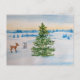 Watercolor painting, a fawn and bunny in a sunrise field, shopping for a Christmas tree, original art by Kristina Anderson printed on a postcard.