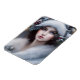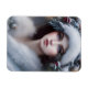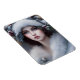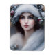 Holiday magnet features a beautiful princess in white fur trimmed hat and wrap with winter foliage in a vintage style portrait. A lovely Christmas themed portrait created with AI generating software