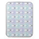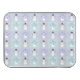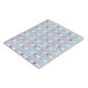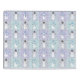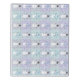 Four squares in pale blues and purples are decorated with snowmen wearing top hats and winter clothing, like toboggans, scarves, and mittens. White stitching adds a decorative touch, giving the repeating pattern the appearance of a quilt, creating a perfectly cozy feeling for winter.