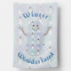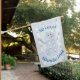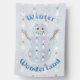 Four squares in pale blues and purples are decorated with snowmen wearing top hats and winter clothing, like toboggans, scarves, and mittens. White stitching adds a decorative touch, giving the repeating pattern the appearance of a quilt, creating a perfectly cozy feeling for winter. The shape of a snowman creates a mask for the design to add a final seasonal touch. Customize the message on the front and back of this flag to create a holiday decoration perfect for your tastes.