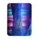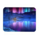 The northern lights glow above a snowy winter landscape. Shafts of pink, purple, blue, and green light up the snow-covered fields and reflect from a frozen lake. By the water stands a cottage with warm light streaming from its windows and smoke coming from the chimney - a cozy refuge from the sparkling cold.
