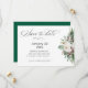 Greenery of pine with white roses make an elegant floral wedding details card. Further accentuated with subtle berries and pine cones. Calligraphy graces the design to set it apart simply, but effectively. It is feminine and stylish, with an edited palette of white, deep pine green, and soft red.