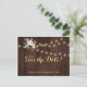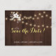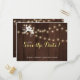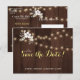 Rustic elegant winter wedding stylish save the date template postcard on dark brown barn wood featuring a small beautiful white flowers bouquet and string of twinkle lights and a trendy gold and white calligraphy script. +++++++ Personalize it with your details! You can choose to customize it further changing background color fonts and colors of lettering. +++++++++++++++ The save date wedding card is suitable for elegant winter rustic country / farmhouse style floral weddings.