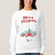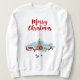 A sweatshirt with a digital image of a painted illustration of a red church and steeple. A bright Christmas star shining overhead. Families out in front arriving for a church service. Winter snow covers the ground and rests on cute bushy pine trees. Merry Christmas written in a red trendy font.