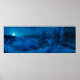 Panoramic view of snowy beach with dunes and Baltic sea surrounded by pine trees forest in Baltic in a moonlight at starry night. View of coast against night sky with stars and full moon.