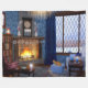 A cozy reading corner on a snowy winter day, with a ginger cat sitting gazing at the blazing fire. Around the hearth are cushy armchairs, with glowing candles and stacks of books and a steaming mug to complete the comfort. Outside a frost-covered willow and beech hedge are obscured by the falling snow.