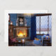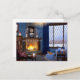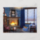 A cozy reading corner on a snowy winter day, with a ginger cat sitting gazing at the blazing fire. Around the hearth are cushy armchairs, with glowing candles and stacks of books and a steaming mug to complete the comfort. Outside a frost-covered willow and beech hedge are obscured by the falling snow.