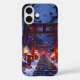 Beautiful anime-inspired phone case depicting a snow-covered shrine with glowing red torii gate and mystical evening smoke. Ideal for serene and scenic winter designs.