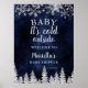 Welcome your little one in style with our 'Baby, It's Cold Outside' welcome sign. This design showcases a shimmering FAUX silver glitter that sparkles like falling snowflakes against a contemporary navy blue watercolor background. The elegant silver pine tree forest detail adds a touch of sophistication to this charming baby shower sign, creating a perfect blend of modern style and winter whimsy.