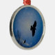 A crow bravely fly through a blue, snow filled winter sky as a perched crow looks on. This is a nice winter or Christmas ornament for a nature lover.