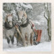 Old fashioned red winter sleigh color image, being pulled through the snow in a forest of snow covered trees by two white draft horses.